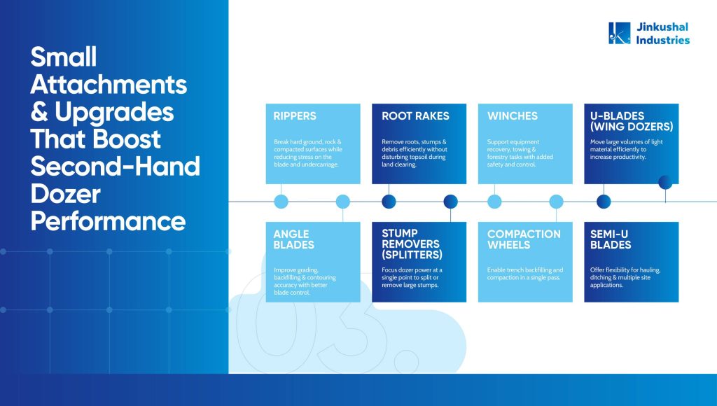 - Better Versatility: Attachments transform your second-hand dozer into a multipurpose machine, allowing you to work in different sectors & jobs.